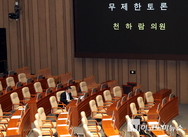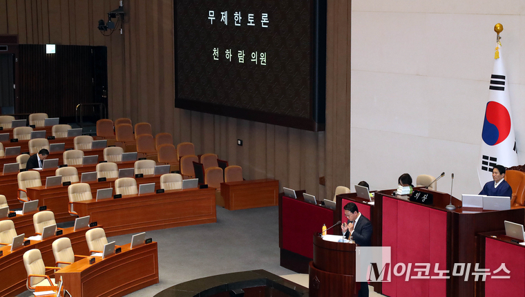 「M포토」 ‘종합특검’ 반대 무제한토론 자리 지키는 정성호