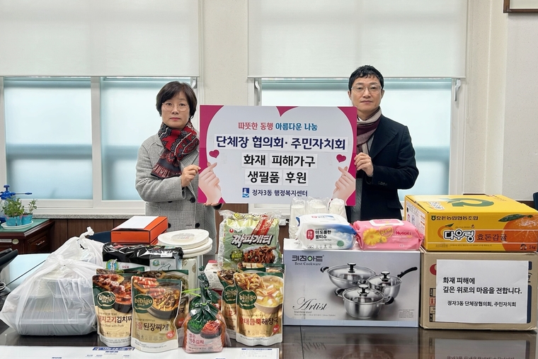 정자3동 단체장협의회와 주민자치회가 이처럼 화재로 생활에 불편을 겪는 피해 가구가 조속히 일상 회복을 할 수 있도록 피해가구에 생필품을 전달하는 등 용기를 심어 준것이다.
