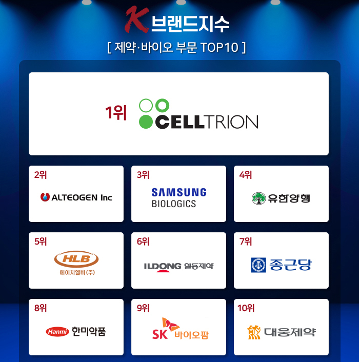K-브랜드지수 제약·바이오 부문은 셀트리온이 1위를 수성한 가운데, 알테오젠(2위), 삼성바이오로직스(3위), 유한양행(4위), HLB(5위), 일동제약(6위), 종근당(7위), 한미약품(8위), SK바이오팜(9위), 대웅제약(10위) 등이 TOP10에 이름을 올렸다.