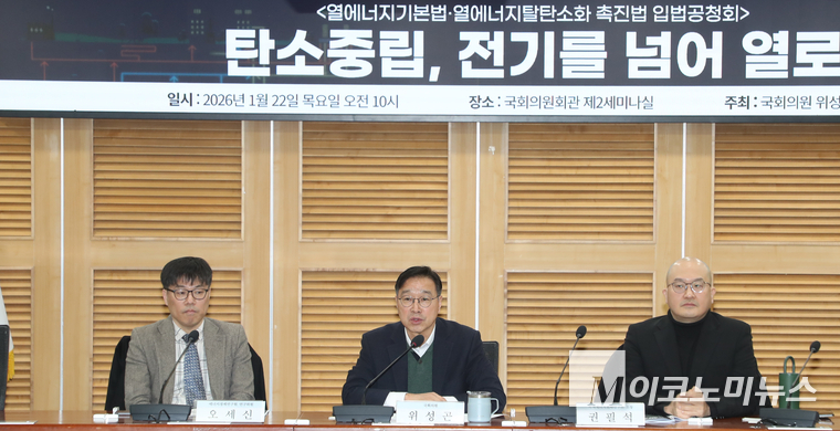 더불어민주당 소속 위성곤 국회 기후위기특별위원회 위원장의 주최로 22일 국회의원회관에서 ‘에너지기본법·열에너지탈탄소화촉진법 입법 공청회’ 탄소중립, 전기를 넘어 열로 행사가 개최됐다.