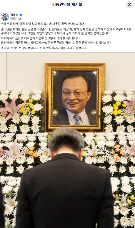 이어 “마지막까지 소임을 다하고자 하셨던 그 걸음의 무게를 생각한다. 총리님께서 평생을 바쳐 지키고자 하셨던 민주주의와 평화, 그 뜻을 굳게 이어 나가겠다”고 덧붙였다.