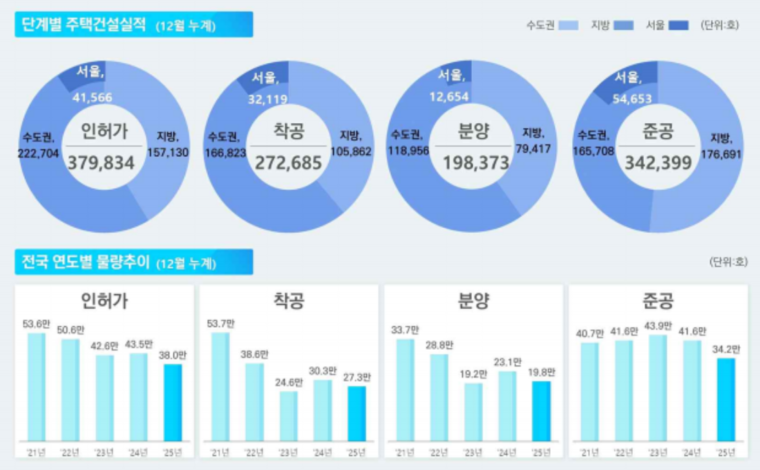 국토교통부가 30일 발표한 ‘2025년 12월 주택 통계’에 따르면 주택 인허가와 분양, 준공 등 공급 지표는 전반적으로 감소세를 보인 반면, 매매와 전월세 거래량은 증가하며 시장 내 거래 회복 흐름이 나타났다.