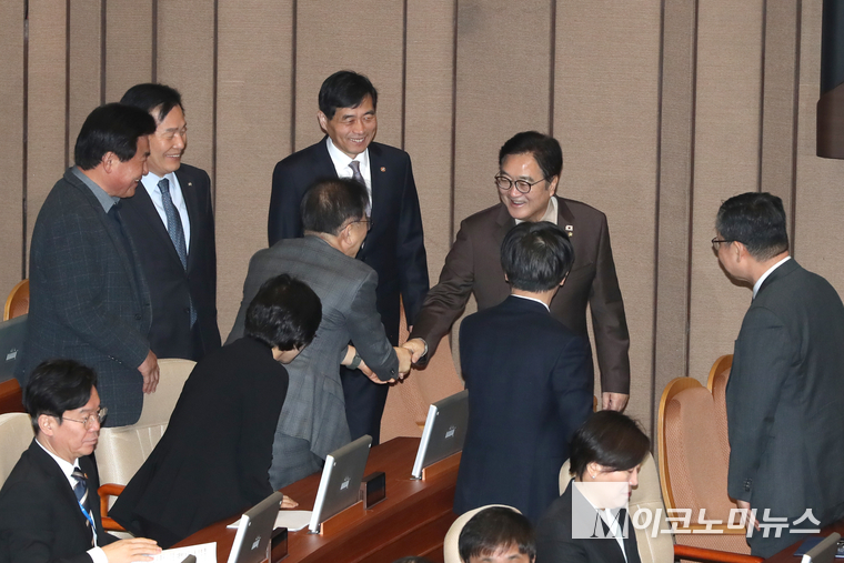 「M포토」 국무위원들과 인사하는 우원식 국회의장