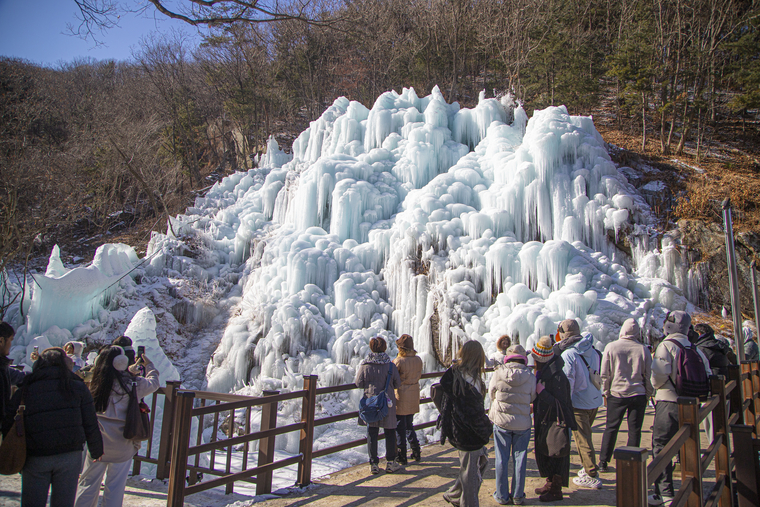 가평 어비계곡은 여름 피서지의 이미지를 벗고 겨울이면 얼음 나라로 변신한다. 계곡을 따라 조성된 데크길과 함께 ‘어비계곡 겨울나라’ 행사 기간에는 회전눈썰매, 전통놀이, 얼음썰매장이 운영된다. 행사장 위쪽으로 더 오르면 계곡 암벽에 인공적으로 조성된 거대한 빙벽이 모습을 드러낸다. 자연과 사람이 함께 만든 얼음 성벽은 한겨울 어비계곡의 상징적인 풍경으로 꼽힌다.