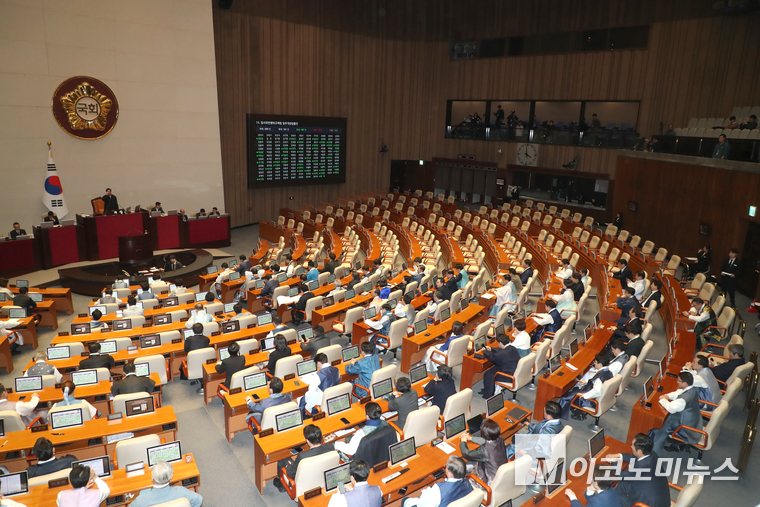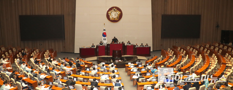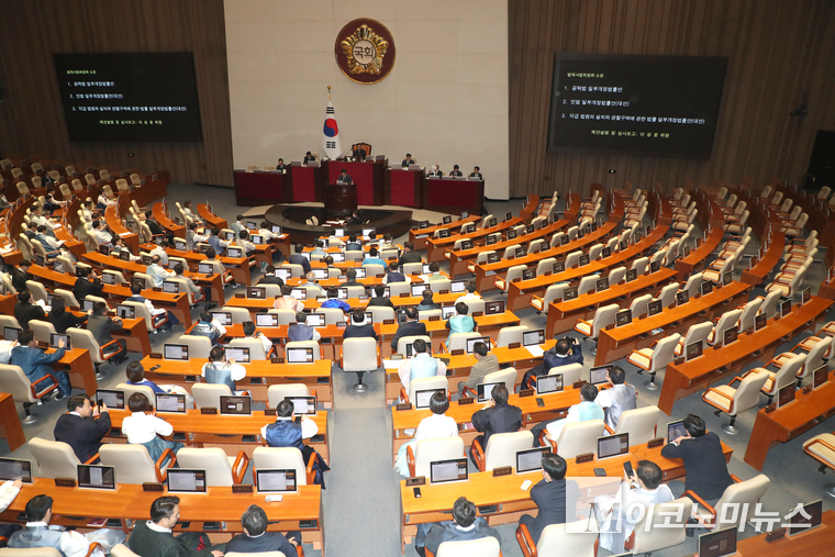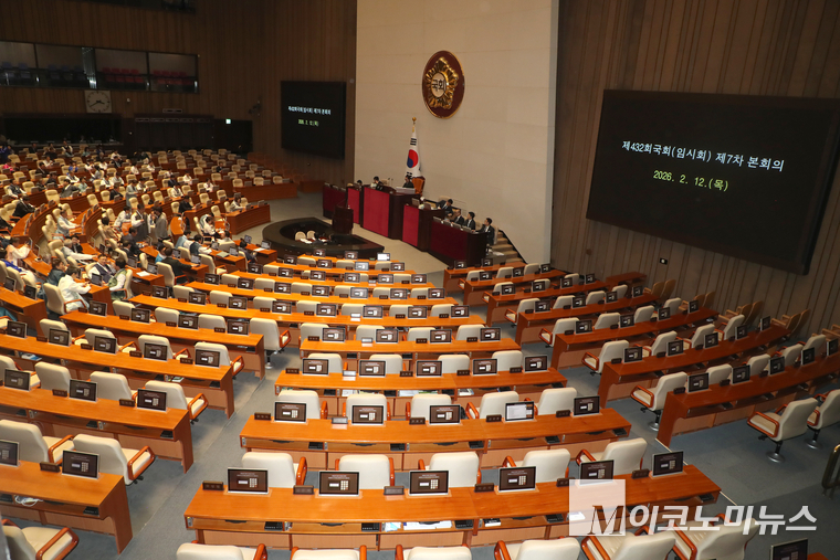 12일 오후 국회에서 열린 제432회 국회(임시회) 제7차 본회의에 국민의힘 의원들의 좌석이 비어 있다. 국민의힘은 어제(11일) 더불어민주당 주도로 국회 법제사법위원회를 통과한 재판소원법과 대법관 증원법을 강하게 비판하며 이날 국회 본회의를 보이콧 뒤 국회 로텐더홀에서 규탄대회를 열었다,