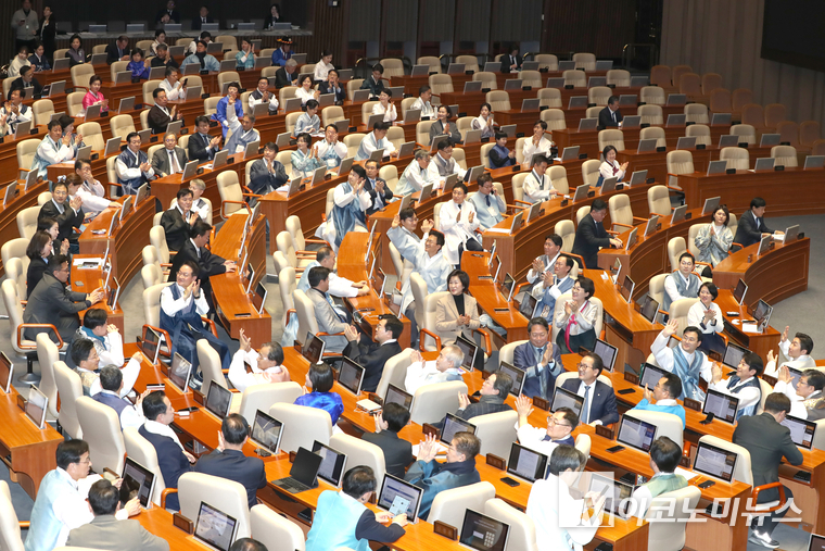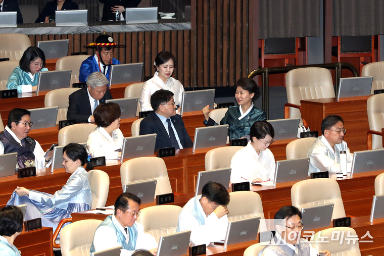 「M포토」 설 앞두고 한복 입고 본회의 참석한 범여권 의원들