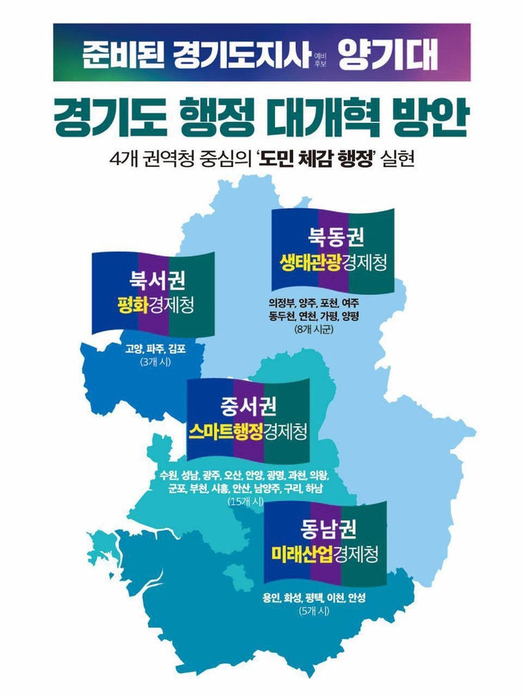 양기대 더불어민주당 경기도지사 예비후보가 경기도 행정 체계를 4개 권역청 중심으로 재편하는 ‘경기도 행정 대개혁’ 구상을 제시했다.
