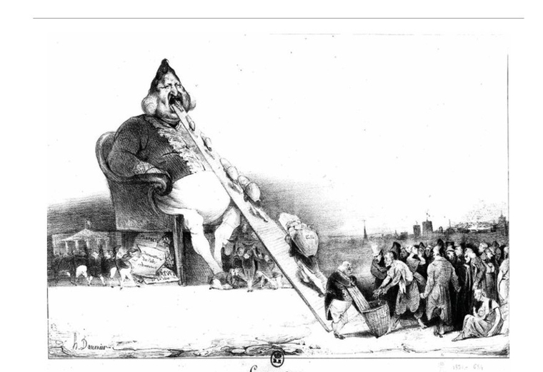 그는 정치적인 풍자로 유명한 화가인데 서민들의 고단한 일상이나 부조리한 정치적 상황, 정치인들을 비판의 시각으로 바라보고 4000여 점의 석판화와 작품으로 발표했다. 그림 속 인물은 라블레 소설 속 주인공 ‘가르강튀아’의 모습이다. 서민들이 바치는 재물을 먹고 있는 모습과 발아래 널브러져 있는 서류 더미가 보인다.