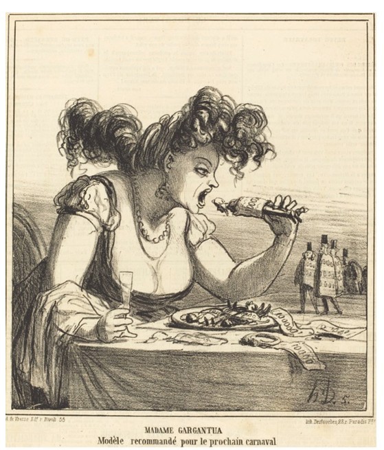 현실에서 그림 속 진짜 주인공은 루이 필립 1세인데 세금 인상에 대한 풍자를 ‘가르강튀아’를 빌려 묘사했다. 의자 밑에는 부르주아들이 국왕의 훈장을 받아들기 위해 손을 뻗치고 있다. 또 다른 작품은 그의 부인으로 보이는 여자의 끊임없는 욕망을 묘사했는데 귀족들이 갖다 바치는 돈을 먹는 괴물처럼 보인다. 소설에서 유래한 ‘팡타그뤼엘리즘’이라는 개념이 있다. 평화롭고 즐겁게, 언제나 좋은 음식을 먹으며 사는 것을 이상적으로 여기는 삶의 태도를 의미한다.