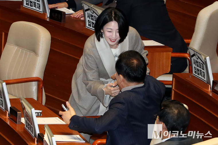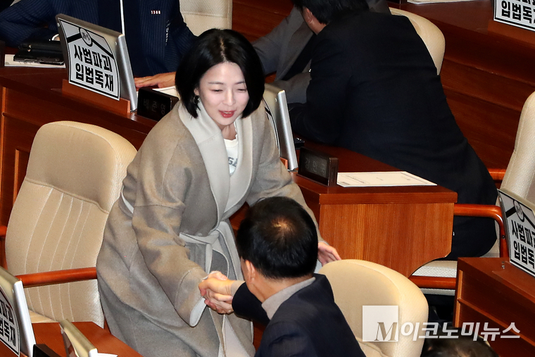 「M포토」 의원들과 인사하는 배현진 국민의힘 의원