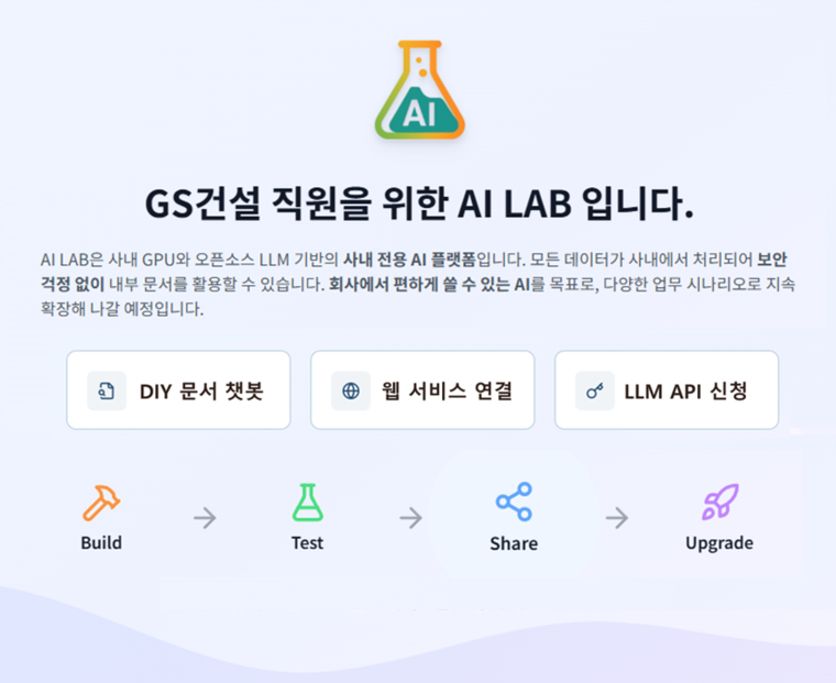 GS건설은 회사가 소유한 GPU를 활용한 자체AI툴인 ‘AI LAB’을 오픈했다고 10일 밝혔다.