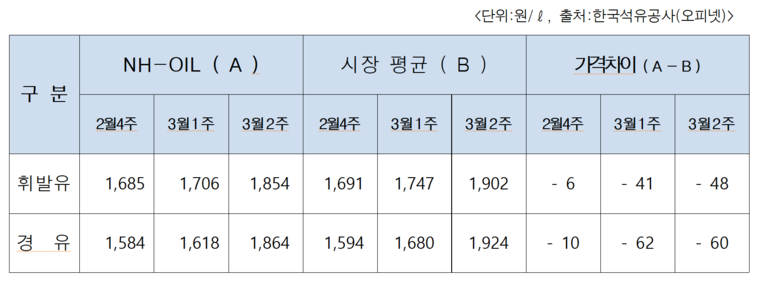농협주유소는 유가 급등이 본격화된 3월 첫째주부터 시장 평균 소비자가 대비 리터당 휘발유 41원, 경유 62원 저렴하게 판매했고, 3월 둘째주에도 시장 평균 대비 휘발유 48원, 경유 60원의 저가 판매를 계속 이어갔다.