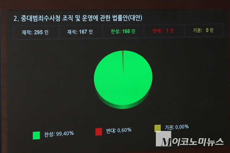 중대범죄수사청(중수청) 설치법이 21일 국회 본회의에서 국민의힘이 표결에 참여하지 않은 가운데 더불어민주당 등 범여권 주도로 통과됐다. 국회는 이날 오후 국민의힘의 필리버스터를 종결시킨 후 표결에 들어가 재석의원 167명 중 찬성 166표, 반대 1표, 기권 0표로 통과시켰다.