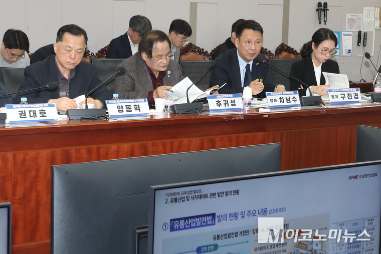 박희승 의원도 축사에서 “요즘 식자재마트가 굉장히 빠르게 커지고 있다. 사실상 일부 품목에서는 거의 독점에 가깝다는 얘기도 나오고 있다”며 “기존에 전통시장이나 소상공인 상권이 많이 위협을 받고 있는 게 현실”이라고 지적했다. 그러면서 “결국 이 문제는 소상공인 보호와 소비자 편익 사이의 균형 문제다. 소상공인도 살고 소비자도 편해질 수 있는 방향으로 좋은 정책이 만들어지기를 기대한다”고 말했다.