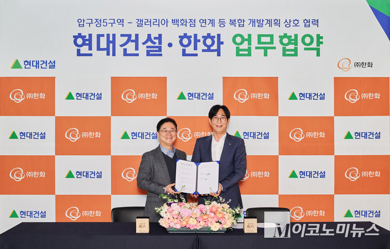 현대건설은 지난 26일 신사동에 위치한 디에이치 갤러리에서 현대건설 이인기 본부장과 ㈜한화 윤성호 본부장이 참석한 가운데 ㈜한화와 ‘압구정5구역 재건축사업’ 협력을 위한 업무협약(MOU)을 체결했다.