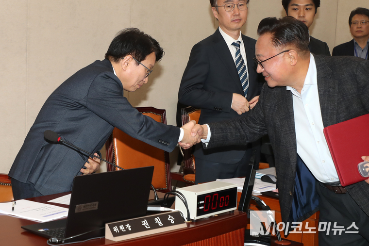 「M포토」 야당 의원들과 인사하는 권칠승 신임 행안위원장