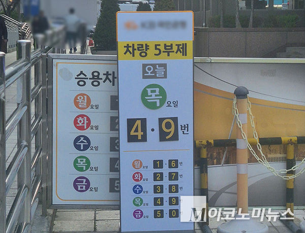 공공기관이 운영하는 공영주차장에는 승용차 5부제가 시행된다. 지방정부와 공공기관이 운영하는 약 3만개 공영주차장, 총 100만면 규모의 노상·노외 유료주차장이 대상이며, 차량번호 끝자리에 따라 요일별 출입이 제한된다. 장애인 차량, 친환경차, 긴급차량은 제외된다. 민원인 차량 역시 5부제를 적용받는다.