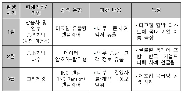 올해 주요 국내 랜섬웨어 사고를 살펴보면 먼저 1월에는 방송사와 일부 중견기업이 다크웹 유출형 랜섬웨어에 노출돼 내부 문서와 계약서가 외부로 유출되는 피해를 입었다.