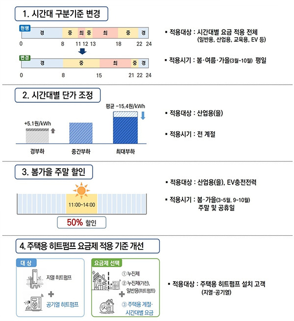 특히 봄·가을 주말과 공휴일 낮 시간에는 전력량 요금의 50%를 할인하는 제도도 도입된다. 산업용 전력 가운데 약 46%를 차지하는 산업용(을)과 전기자동차 충전전력이 우선 적용 대상이다. 산업용(을)은 대규모 사업장이 사용하는 시간대별 요금 체계로, 이번 개편안의 직접적인 영향을 받는다. 반면 소규모 공장이 주로 사용하는 산업용(갑)은 단순 요금 체계로 별도 적용된다.
