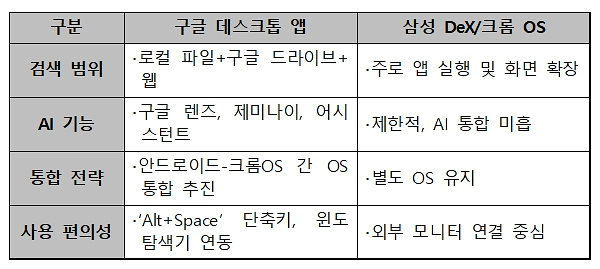 구글이 데스크톱 앱을 출시한 근본적인 이유는 윈도 생태계 속에서 생산성 도구로서의 입지를 강화하고, 안드로이드와 크롬OS를 통합해 모바일과 PC 경험을 하나로 묶으려는 전략적 판단이 작용했기 때문이다. 구글은 앞으로 AI 기반 검색·업무 지원 기능을 확대하고, 다국어 지원 및 다양한 기기간 일관된 사용자 경험을 제공하는 방향으로 나아갈 가능성이 있는 것으로 분석되고 있다.