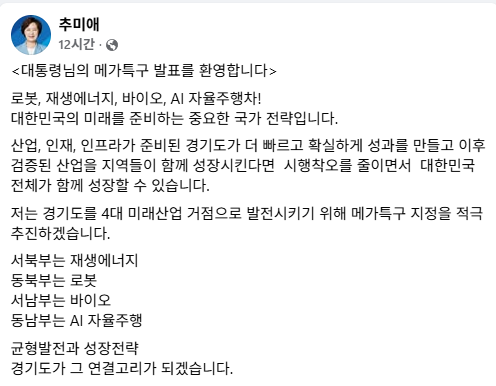 추 후보는 이날 페이스북을 통해 “로봇, 재생에너지, 바이오, AI 자율주행 등은 대한민국의 미래를 좌우할 핵심 전략 산업”이라며 “산업 기반과 인재, 인프라가 집적된 경기도가 선도적으로 성과를 만들 수 있다”고 강조했다.