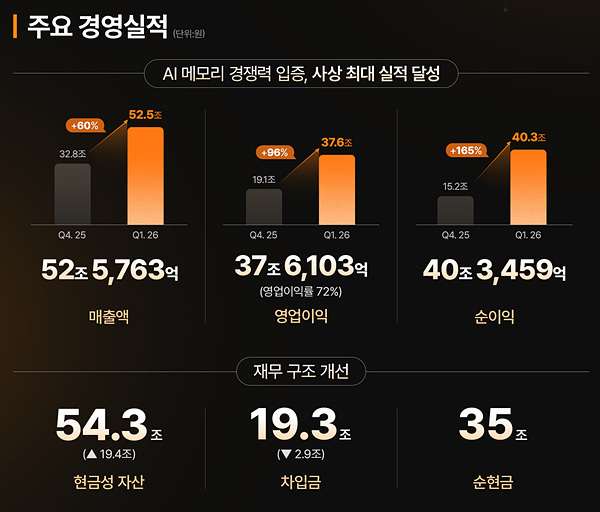 회사는 계절적 비수기임에도 불구하고 AI 인프라 투자 확대가 이어지면서 HBM, 고용량 서버용 D램 모듈, eSSD 등 고부가가치 제품 판매가 크게 늘어난 것이 실적 상승을 견인했다고 설명했다. 이러한 호조로 1분기 말 기준 현금성 자산은 전분기 대비 19조4000억원 증가한 54조3000억원을 기록했으며, 차입금은 2조9000억원 감소한 19조3000억원으로 줄었다. 이에 따라 순현금 규모는 35조원에 이르렀다.
