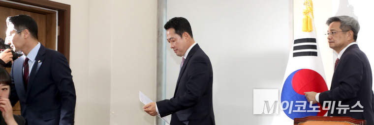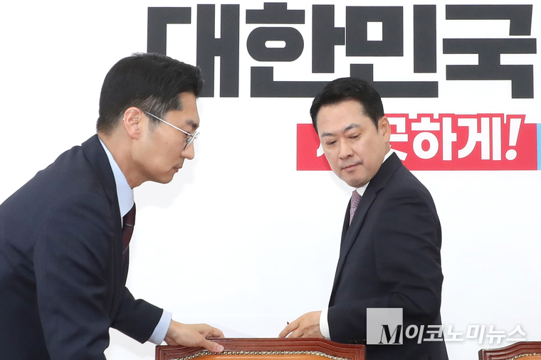 「M포토」 기자간담회 마치고 이동하는 장동혁 국민의힘 대표