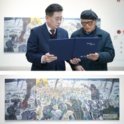 원로작가 이동표 화백의 작품 기증식이 23일 오전 양평군립미술관 지하 전시장에서 진행됐다. 전진선 양평군수가 직적 기증증서를 수여한 기증식은 작가의 작품 설명과 전시 관람으로 진행됐다. 이날 기증된 작품은 '양평군 지평면 지평리 전투 대승하다'(356×132㎝, 2010년)로, 양평군립미술관 2025년 겨울 기획 전시 '전쟁과 평화, 삶의 서사' 출품작이다. 1932년 황해도 해주 출신의 실향민인 이동표 화백은 고향 상실의 기억과 향수를 작품 세계의 정서적 기반으로 삼아왔다. 1994년 양서면 복포리에 입향한 이후 지역을 기반으로 왕성한 창작 활동을 이어오며, 양평 미술계의 원로로서 지역의 정체성 형성과 미술 문화 발전에 꾸준히 기여해 왔다. 이 화백의 작품은 잃어버린 고향에 대한 기억과 그리움을 서정적으로 표현하고, 개인의 체험을 시대적 기억으로 확장해 온 것이 특징이다. 전진선 군수는 “지평리 전투의 상징적인 장면과 현장감을 담은 뜻깊은 작품을 기증해 주신 데 깊이 감사드린다”며 “기증 작품의 영구적인 보존과 관리에 최선을 다하고, 지역 문화유산으로 널리 활용될 수 있도록 노력하겠다”고 밝혔다. 기증된 작품은 양평군립미술관 수장고에 보관되며, 군립미술관