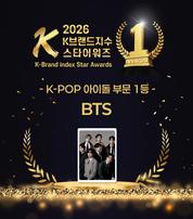 빅데이터 평가 기관인 아시아브랜드연구소는 '2026 K-브랜드지수 스타어워즈' K-POP 아이돌 부문 1위에 BTS(방탄소년단)가 최종 선정됐다고 5일 발표했다. K-브랜드지수는 아시아브랜드연구소가 국내외 연구진과 협력해 개발한 빅데이터 시스템으로, 기존의 빅데이터 분석 시스템과 달리 후보 표본 추출부터 인덱스 선별까지 분야별 자문위원단의 검증을 토대로 진행하고 있다. 이번 2026 K-브랜드지수 스타어워즈 K-POP 아이돌 부문은 포털사이트 검색량 상위 30위를 대상으로, 2025년 1월 1일부터 2026년 2월 28일까지의 온라인 빅데이터 126억 2177만 8969건을 분석했다. 특히, 이번 어워즈 순위는 기존 빅데이터 분석 결과에 팬덤 투표 플랫폼 ‘스타덤(Stardom)’을 통해 진행된 공식 투표 결과를 합산하여 최종 산출됐다. 대중문화 산업의 핵심인 팬덤의 실질적인 투표 참여 데이터를 브랜드 영향력 평가에 본격적으로 적용함으로써 시상의 변별력과 대중성을 한층 높인 것으로 평가된다. 2026 K-브랜드지수 스타어워즈 K-POP 아이돌 부문은 BTS가 1위에 등극했으며, 스트레이 키즈(2위), 세븐틴(3위), 제로베이스원(4위), 플레이브(5위), 블