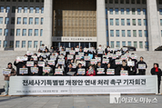 국회에서 “전세사기특별법 피해자 외면 말고 연내에 개정하자”는 목소리가 터져 나왔다. 전세사기 피해자와 시민사회단체, 여야 의원들은 4일 국회 본청 계단 앞에서 기자회견을 열고 △최소보장 도입 △피해자 인정 요건 완화 △신탁사기, 다세대 공동담보 피해주택 지원을 위한 배드뱅크 도입 △임대인 동의 없는 피해주택 시설 관리 방안 마련 등을 담은 전세사기특별법 개정안의 연내 처리를 강력히 촉구했다. 염태영 의원은 “전세사기 피해자를 위한 예산과 법안이 후순위에 몰려 있어서 송구스러운 마음”이라며 “올해 안에 소위원회를 열어 특별법을 처리하겠다고 약속드리겠다”고 했다. 윤종오 진보당 의원 역시 “이미 여야 의원들이 함께 참여한 전세사기특별법 개정안이 국회에 제출되어 있는 만큼, 연내에 반드시 피해자와 시민사회의 요구를 반영한 전세사기특별법 개정안을 처리해야 한다”면서 “전세사기 방지를 위해서는 전세구조를 근본적으로 개혁하는 논의와 함께, 임차권등기 의무화 등으로 세입자의 법적 지위를 향사하는 주택임대차보호법의 개정 또한 절실하다”고 지적했다. 조국 조국혁신당 대표는 “전세사기는 단순히 개인의 불행이 아닌 모두 나서서 돕고 짐을 나눠 져야 할 사회적 재난”이라며 “산