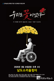 - 장애 배우들이 직접 들려주는 삶의 이야기… 24일 남도소리울림터 "휠체어 바퀴가 무대 바닥을 천천히 구른다. 청각장애 배우의 손끝이 허공을 가르며 말을 대신한다.다음 대사를 꺼내기 전 흐르는 짧은 정적마저 무대의 일부가 된다." 오는 24일 오후 4시 남도소리울림터에서는 장애인 배우들의 삶을 담은 연극 <우리도 꽃이었다>가 무대에 오른다. 전남교육청이 주최하고 전문예술극단 예인방이 주관하는 이번 공연은 장애인 배우들이 자신의 삶을 담아낸 연기를 통해 장애에 대한 편견을 허물고 깊은 울림을 전하는 직장 내 교육 프로그램의 일환으로 기획됐다. 다양한 장애를 가진 배우들은 직접 무대에 올라 자신의 삶을 들려주는 옴니버스 형식의 연극으로 가상의 연기가 아닌, 장애 당사자의 실제 목소리를 통해 기존의 틀을 벗어난 새로운 방식의 장애인식개선 교육을 선보이게 된다. 연출을 맡은 배우 김진호 씨는 작품의 출발점을 "장애를 설명하는 순간 사람은 사리지고 증상만 남는다"며 "장애를 설명하기 보다는 그저 한 사람의 삶을 무대 위에 세우고 싶었다"고 말했다. 김진호 연출은 연극 무대와 방송을 오가며 활동해 온 중견배우로 사극드라마는 물론, 최근에 방영된 드라마 〈판