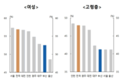 부산이 2021년 특·광역시 가운데 가장 먼저 초고령사회(65세 이상 인구 20% 초과)에 진입하고 이후 고령화 진행 속도도 가장 빠르지만, 여성과 고령층의 경제활동참가율은 전국 최하위권인 것으로 나타났다. 26일 한국은행 부산본부 경제조사팀 곽승주 과장, 금정현 조사역, 이유경 청년인턴이 발표한 '최근 부산지역 고용상황 평가 및 시사점' 조사연구보고서에 따르면, 지난해 부산의 60세 이상 고령층 비율은 36.7%로, 전국 7개 특·광역시 가운데 가장 높다. 15세 이상 인구 가운데 여성이 차지하는 비율도 52.1%로 서울(52.75)에 이어 두 번째로 높다. 그러나 여성과 고령층의 경제활동참가율은 각각 52.5%와 41.2%로, 전국 17개 시도 가운데 각각 16위와 15위에 그쳤다. 주당 평균 15시간 미만 근무하는 초단시간 근로자 비중도 7.4%로 전국 평균 6.2%를 웃돌았다. 보고서는 "부산지역은 고령인구 비중이 높고 그 증가 속도 또한 빠르므로 향후 생산가능인구 감소와 그에 따른 노동공급 감소 가능성이 우려되는 상황"이라며 "장기적 노동공급 기반 확충을 위해 여성 및 고령층 경제활동참가율을 높이고, 청년 유출을 완화하기 위해 청년층 선호 일자리 확