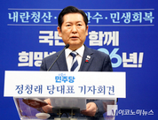 정청래 더불어민주당 대표가 26일 당대표 취임 후 첫 공식 기자회견에서 “지방선거 승리의 기세를 몰아 완전한 내란 청산과 개혁 완수, 민생 회복, 한반도 평화를 이룩하겠다”고 밝혔다. 정청래 대표는 이날 국회 본관 당대표 회의실에서 “검찰개혁, 사법개혁, 당내민주주의 개혁을 마무리 짓고 당원주권시대의 힘으로 지방선거를 승리로 이끌겠다”며 이같이 밝혔다. 정 대표는 “12.3 비상계엄 내란 사태가 발생한지 벌써 1년도 지났지만, 아직도 처벌받은 책임자가 단 한명도 없다. 내란은 끝나지 않았다”며 “지금도 내란과의 전쟁은 계속되고 있다. 내란 진압은 한시도 멈출 수 없다”고 강조했다. 이어 “헌정질서와 민주주의를 철통같이 수호하며 내란 세력을 엄정히 단죄해야 할 사법부가 오히려 내란 세력의 방패막이를 자처하며 내란 청산의 훼방꾼이 된 것이 문제”라고 지적했다. 또 “사법부 독립은 헌법 위의 특권이 아니다. 오직 법과 원칙대로 판결할 때 국민의 신뢰도 돌아올 것”이라며 “조희대 사법부가 12.3 비상계엄 내란 사태 당시, 또 서부지법 폭동 사태 당시, 사법부의 독립을 목청껏 외쳤더라면 지금과 같은 사법부에 대한 국민 불신도 없었을 것”이라고 비판했다. 아울러 “2