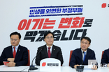 송언석 국민의힘 원내대표가 13일 “민주당이 15일 본회의에서 3대 특검 재연장법을 밀어붙인다면 국민의힘은 모든 수단을 다 동원해 맞서 싸울 것이다. 필리버스터도 포함된다”고 밝혔다. 송원석 원내대표는 13일 국회 본관에서 열린 원내대책회의에서 “2차 종합 특검법은 (내란·김건희·순직 해병) 3대 특검 재연장법에 불과하다. 내란 몰이 공작일 뿐”이라며 이같이 밝혔다. 송 원내대표는 “3대 특검 재연장법의 목표는 오로지 6·3 지방선거를 내란 몰이 선거로 만들겠다는 술수”라며 “국민의힘 현역 단체장들을 계엄 동조범으로 몰아 정치적 타격을 주겠다는 선거 공작”이라고 주장했다. 또 “민주당은 신임 원내지도부 1호 법안을 일방적 야당 탄압 특검법으로 처리할 것인가”라며 “야당을 협상 파트너이자 국정의 한 축으로 인정한다고 한 한병도 원내대표 취임 일성이 삼일천하로 그쳐 국회가 또다시 무한 정쟁 속으로 들어가는 일이 없기를 촉구한다”고 목소리를 높였다. 이어 “지금 시급한 것은 2차 종합 특검이 아니라 통일교의 정치권에 대한 금품 제공 문제를 밝힐 통일교 특검과 김병기-강선우-김경 등으로 이어지는 공천 뇌물 특검 추진이 시급하다”며 “집권여당은 비겁하게 통일교 특검을