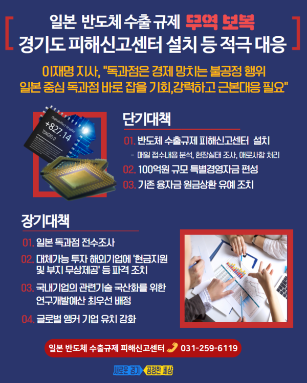 일본의 반도체 수출규제 조치가 4일부터 시행되자 경기도가 피해기업 지원을 위한 피해신고센터를 설치하고 일본 제품의 독과점 현황을 전수조사 하는 등 즉각적인 대응에 나섰다.