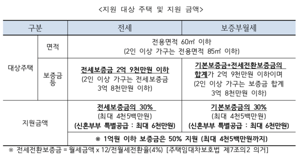 지원 대상 주택은 순수 전세주택과 보증부월세주택이다. 보증금 한도는 1인 가구의 경우 순수 전세의 전세금 또는 보증부월세의 기본보증금과 전세전환보증금의 합이 2억9,000만원 이하, 2인 이상의 가구의 경우 최대 3억8,000만 원 이하의 주택이다. 대상주택의 전용면적은 1인 가구는 60㎡ 이하, 2인 이상 가구는 85㎡ 이하다.