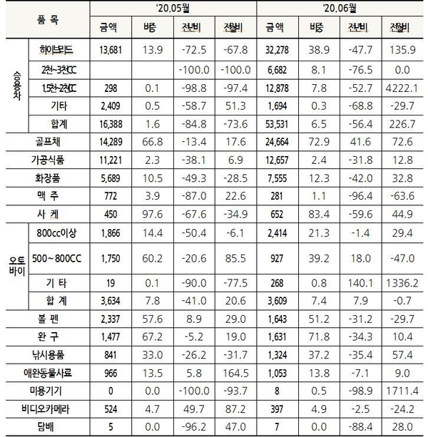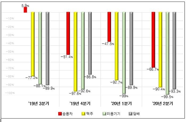 담배의 경우에도 전년 2분기 대비 평균 93.3% 감소했으며, 미용기기는 전년 6월 대비 98.9% 감소했다. 가공식품, 사케, 낚시용품 등의 수입량이 줄어든 것으로 나타났다.