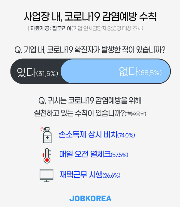 취업플랫폼 잡코리아는 최근 기업 인사담당자 365명을 대상으로 <코로나19 감염예방 실천 정도>에 관한 주제로 설문을 실시했다.