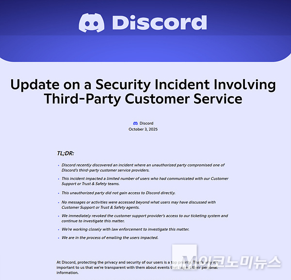 디스코드는 현지시각으로 이달 3일 공식 블로그를 통해 “최근 외부 공격으로 디스코드의 제삼자 고객 서비스 제공업체 중 한 곳이 침해됐다”며 “이번 해킹으로 고객지원팀 및 보안팀과 소통했던 일부 사용자에게 피해가 발생했다”고 밝혔다. 하지만 이번 해킹은 디스코드 시스템 자체를 공격하지는 않았다.