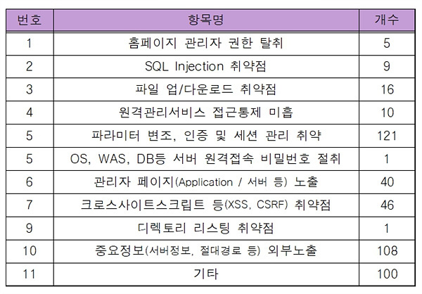 가장 많이 발견된 취약점은 △파라미터변조와 인증·세션관리로 121건 △중요정보(서버정보·절대경로 등) 노출 108건 △크로스 사이트 스크립트 등(XSS·CSRF) 취약점 46건 등이다.