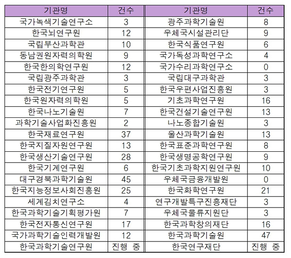 기관별로 살펴보면 한국과학기술원(KAIST, 47건)이 가장 많았고 대구경북과학기술원(DGIST, 45건), 한국재료연구원(37건), 한국생산기술연구원(28건), 한국지능정보사회진흥원(25건), 한국화학연구원(21건) 등이 뒤를 이었다.