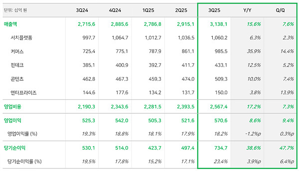 콘텐츠는 웹툰의 성장과 카메라 앱 유료 구독자 수 확대 등으로 전년 동기 대비 10.0%, 전분기 대비로는 7.4% 증가한 5093억원으로 견조한 성장세를 지속했다.