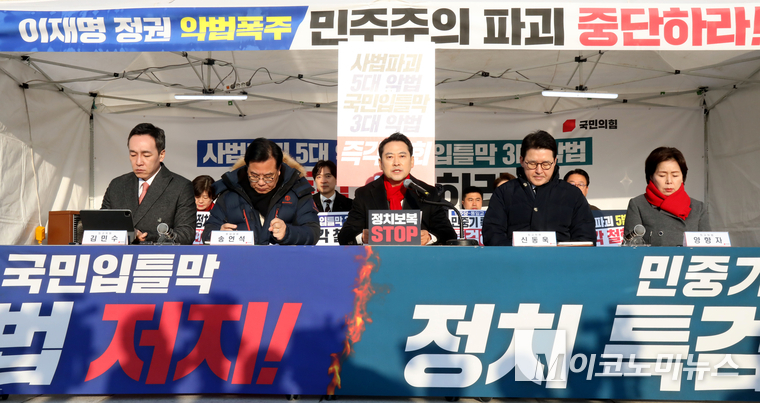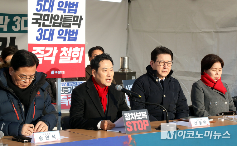 「M포토」 천막에서 열린 최고위에서 발언하는 장동혁