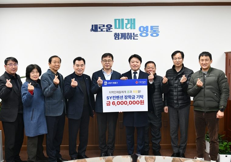 수원시 영통구는 "지난 15일, 관내에 소재한 SY컨벤션이 경제적으로 어려운 영통구 지역내 학생들을 지원하기 위해 장학금 600만 원을 기탁해 왔다"고 16일 밝혔다.