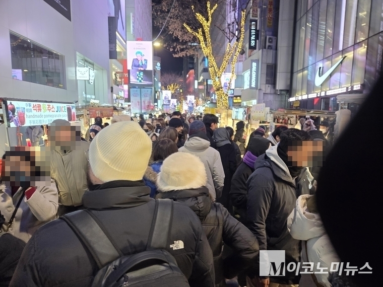 성탄절을 맞아 서울 명동 일대는 영하권의 매서운 추위에도 연말 분위기를 즐기려는 인파로 북적였다. 길거리 음식을 판매하는 노점 앞에는 줄을 서서 기다리는 시민들이 많았고, 곳곳에는 경찰 병력이 배치돼 "계속 이동하십시오'라며 쉼 없이 보행 흐름을 안내했다.
