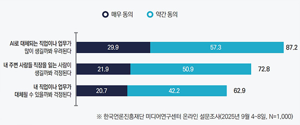 우리나라에서 AI의 도입은 일자리 불균형을 심화할 것이라는 데는 10명 중 6명이 동의했다. AI의 도입으로 특히 줄어드는 일자리는 반복·규칙 기반인 사무·행정직, 고객센터·콜센터 상담원, 기초 콘텐츠 제작자(초급 디자이너·카피라이터), 기초 프로그래밍·QA 테스터 직무 등이었다.