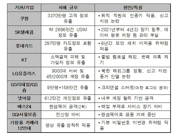 쿠팡은 3370만명, SK텔레콤은 2324만명, 넷마블은 612만명, 롯데카드는 297만명 등이다. 우리나라 전체 인구가 5160만명에 달하는 만큼 중복 없이 단순 계산으로 봐도 한국인 전체가 최소한 개인정보 유출을 1회 이상 겪은 셈이다.