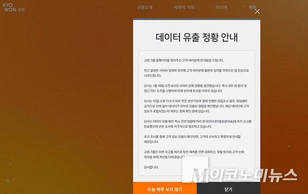 해킹 사고가 발생한 지 닷새째이지만, 교원그룹은 아직 고객 개인정보 유출 여부를 확인하지 못하고 있다. 교원그룹은 14일 보도자료를 통해 “현재 데이터 외부 유출 정황을 확인한 단계로 고객 정보가 실제로 포함됐는지 여부는 관계 기관, 보안 전문기관과 협력해 정밀 조사를 진행 중”이라며 “고객정보 유출 사실이 확인되면 투명하게 안내할 방침”이라고 밝혔다. 앞서 교원그룹은 이달 10일 오전 8시 무렵 사내 일부 시스템에서 비정상 징후를 확인하고 같은날 오후 9시 무렵 KISA와 관련수사기관에 침해 정황을 신고했다. 또 이달 12일 오후에는 데이트 유출 정황을 확인하고 전날 KISA와 개인정보보호위원회에 관련 내용을 신고했다.