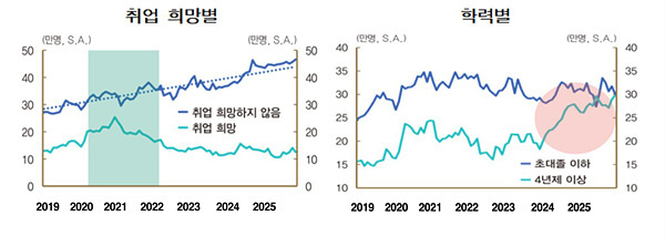 경제 성장률이 눈에 띄게 회복되지 않는 가운데 청년들 가운데서도 ‘쉬었음’ 상태의 비중이 늘어날 뿐 아니라, 아예 취업 자체를 원하지 않는 젊은이도 급증하고 있다. 청년층의 노동시장 영구 이탈 우려가 커지고 있다. 특히 초급대학(이하 초대) 졸업 이하 청년 대상의 취업 유인책이 절실하다는 게 한국은행의 조언이다.