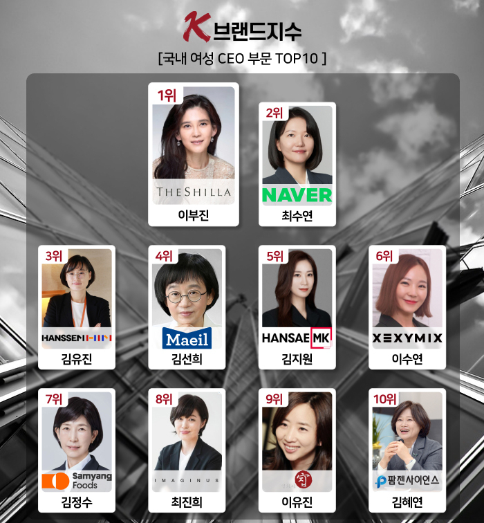 K-브랜드지수 여성 CEO 부문은 1위 이부진(호텔신라)에 이어 2위 최수연(네이버), 3위 김유진(한샘), 4위 김선희(매일유업), 5위 김지원(한세엠케이), 6위 이수연(젝시믹스), 7위 김정수(삼양식품), 8위 최진희(이매지너스), 9위 이유진(영화사집), 10위 김혜연(팜젠사이언스) 등이 TOP10에 이름을 올렸다.